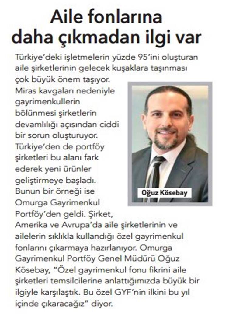 Omurga Gayrimenkul ve Girişim Sermayesi Portföy Yönetimi A.Ş. Genel Müdürü Oğuz Kösebay, Özel gayrimenkul fonu fikrini aile şirketleri temsilcilerine anlattıklarında büyük bir ilgiyle karşılaştıklarını ve bu özel GYF’nin ilkini bu yıl içinde çıkaracaklarını belirtiyor. Haberin Devamı için Tıklayın...